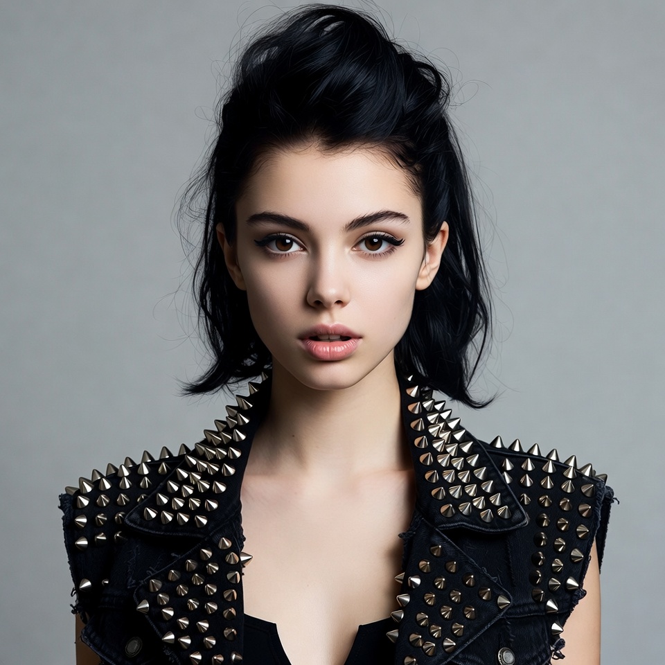 A young woman with long dark hair styled in a messy updo gazes at the camera with a subtle pout. She wears a black leather vest adorned with silver spikes on the shoulders and a black top underneath. The image features a plain gray background, highlighting her striking features and edgy attire.