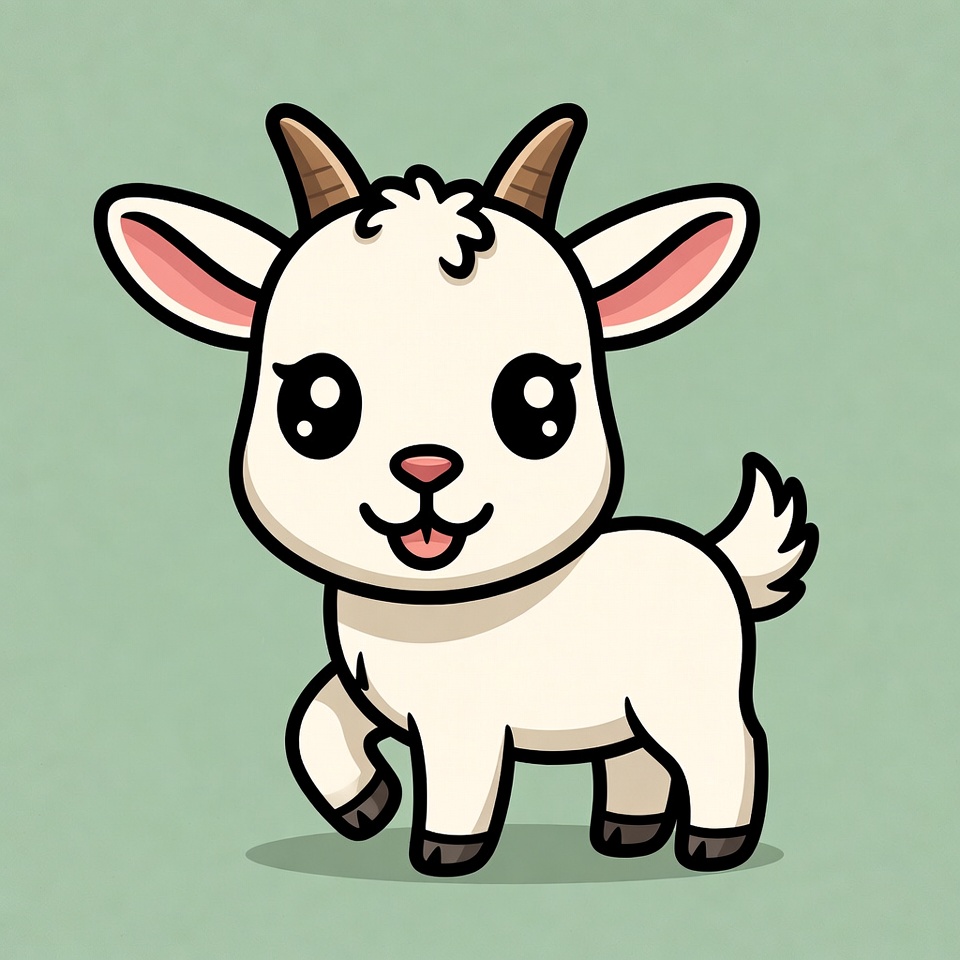 adorable goat, animal, baby goat, big eyes, cartoon animal, chibi goat, clipart, cute goat, fluffy fur, goat illustration, isolated background, kawaii animal, kawaii goat, kid goat, pink ears, small horns, smiling goat, walking goat, white goat, cartoon goat