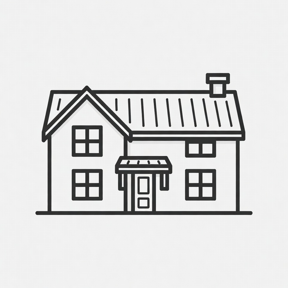 A simple black line illustration of a two-story house features a sloped roof with a chimney, multiple rectangular windows, and a covered front porch with a door. The house is depicted from the front view on a plain white background. Clean outlines emphasize architectural details like the awning and siding.