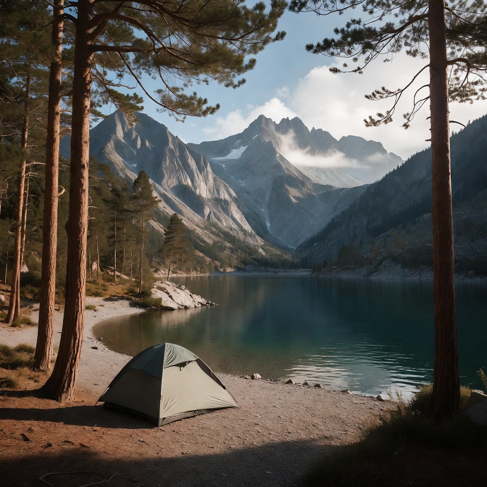 A green tent is pitched on a sandy beach beside a turquoise mountain lake. Tall pine trees frame the scene, with rugged snow-capped peaks and clouds reflected in the calm water. The landscape features a mix of forest, rocky shores, and distant glaciers under a clear sky.