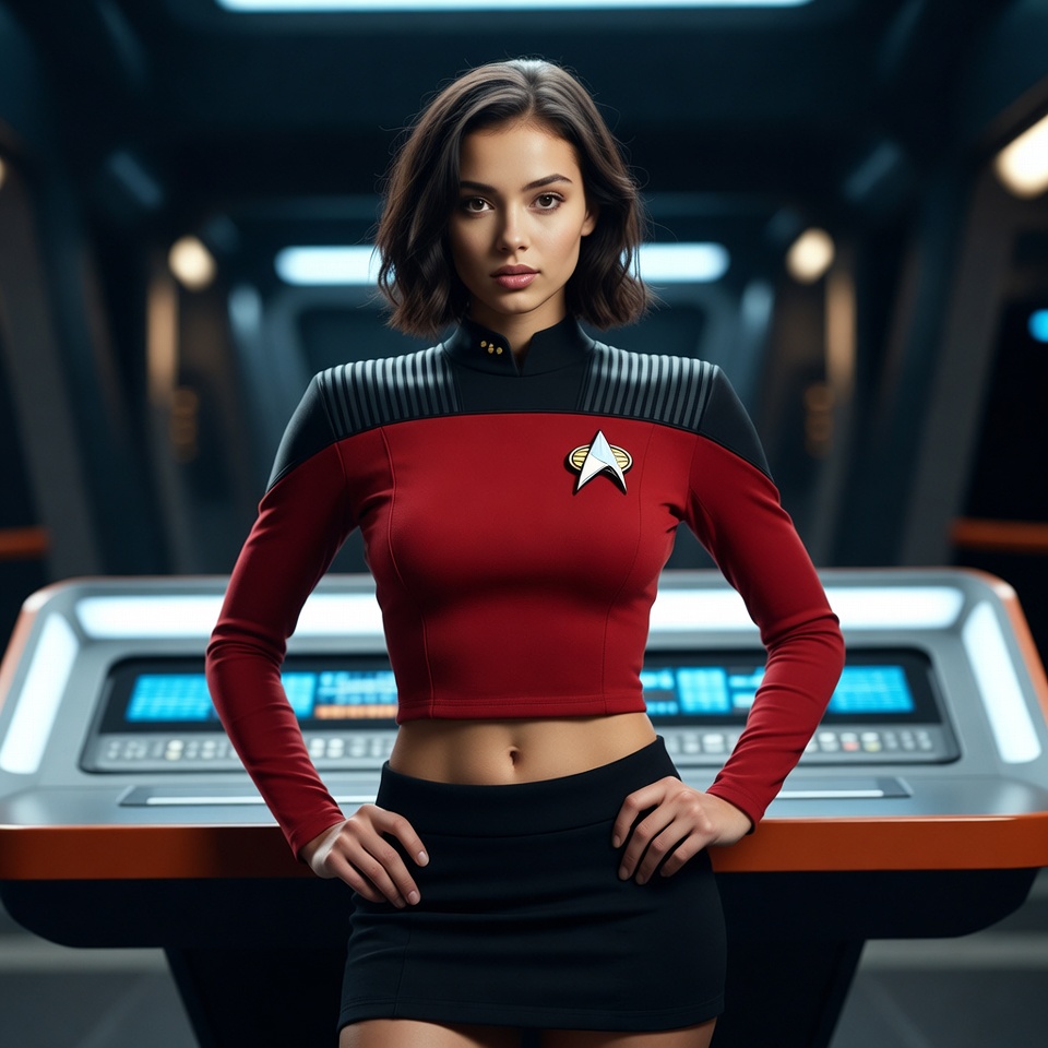 Star Trek, Starfleet, badge, black skirt, blue lighting, communicator, confident pose, console, corridor, dark hair, female, futuristic, hands on hips, metallic panels, midriff, red uniform, sci-fi, short hair, spaceship, standing, woman