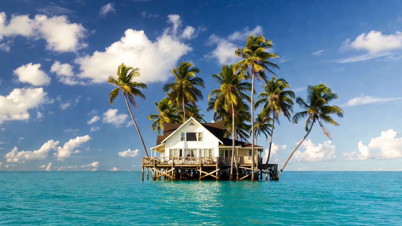 A white wooden house with a sloped roof stands on tall stilts in the middle of a turquoise ocean. It is surrounded by several tall palm trees with green fronds. The sky is bright blue with scattered white clouds.