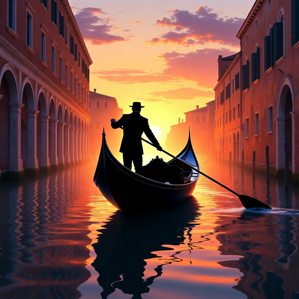 A black silhouette of a gondolier in a hat rows a gondola through a narrow Venice canal at sunset. Tall brick buildings with arches line both sides of the calm water, reflecting the vibrant orange and pink sky. The setting sun glows behind the gondolier and boat.