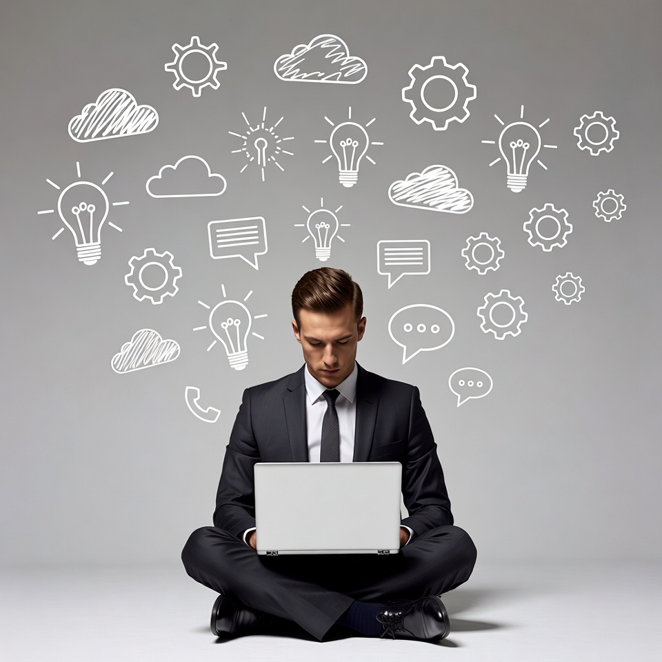 A young man with short brown hair sits on the floor wearing a dark suit and tie, intently working on a white laptop. Surrounding him are hand-drawn sketch icons including lightbulbs, gears, clouds, speech bubbles, and a sun on a plain gray background. The image features a clean, isolated white background with illustrative elements.
