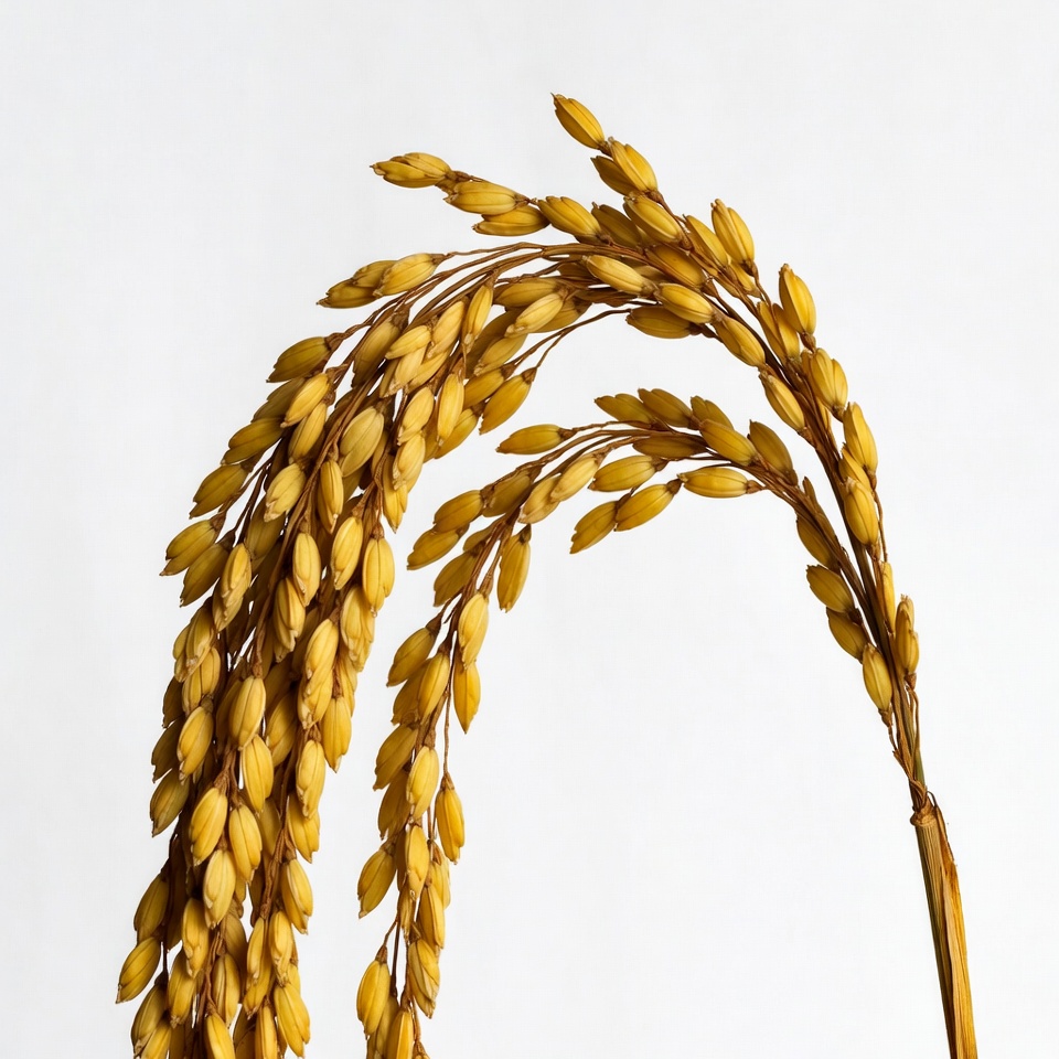 A single golden rice stalk with numerous ripe grains curves gracefully against a plain white background. The stem bends elegantly, showcasing clusters of yellowish-brown rice grains. It is isolated for clear visibility.