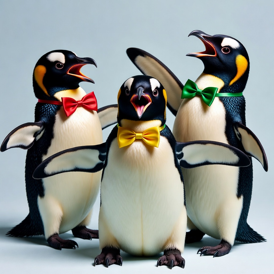 Three cartoon penguins stand together on a plain blue background, each wearing a different colored bow tie. The left penguin has a red bow tie, the center one a yellow bow tie, and the right one a green bow tie. All three have open beaks as if singing, with black and white feathers and yellow accents on their heads.