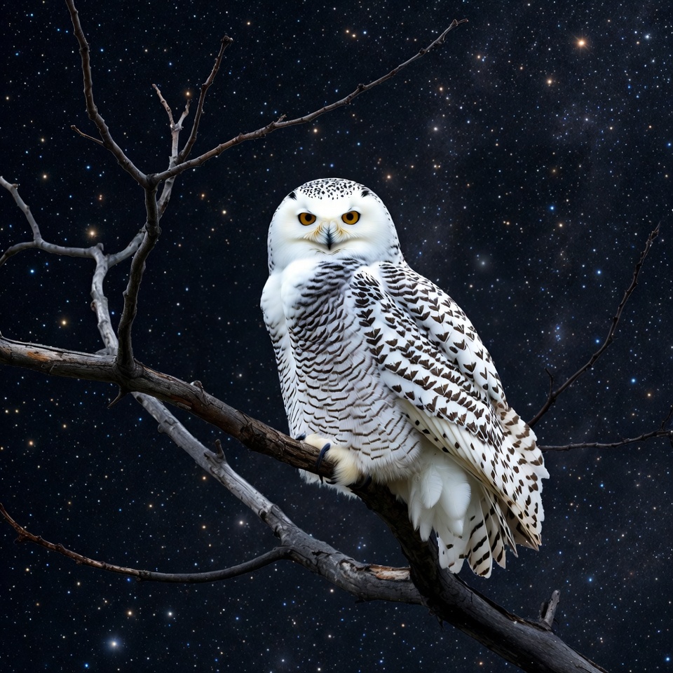 A snowy owl with white feathers speckled in black sits perched on a bare tree branch. Its bright yellow eyes gaze forward against a starry night sky. The owl's talons grip the branch firmly, with wings slightly folded.