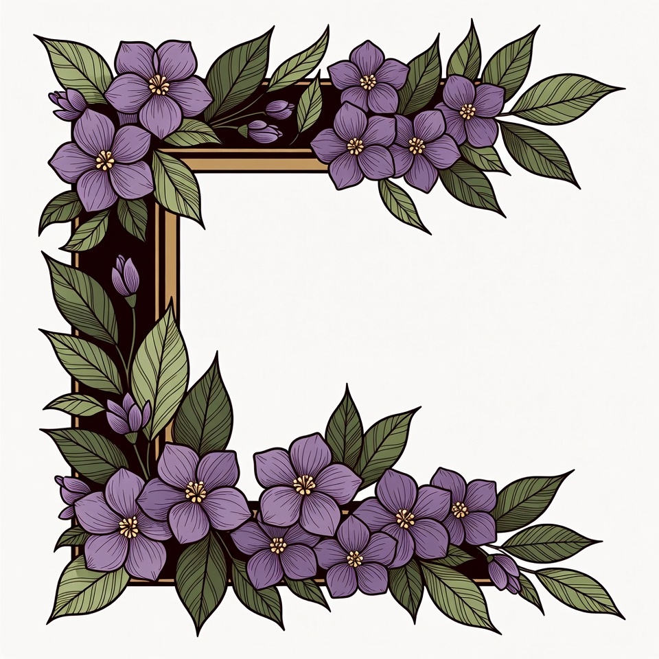 clipart, decorative frame, floral border, floral design, flower buds, flower frame, frame border, golden frame, green leaves, illustration, isolated background, leaf patterns, ornate frame, purple blossoms, vector art, purple flowers