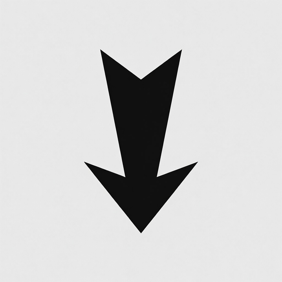A bold black downward-pointing arrow is centered on a light gray background. The arrow features sharp, angular edges and a simple, minimalist design. It is isolated with ample white space around it.