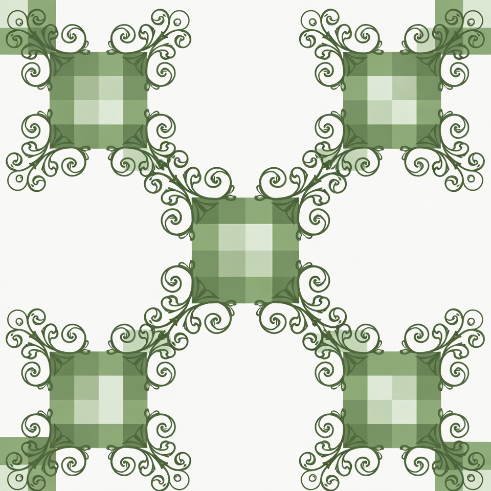 A symmetrical vector pattern features four light green checkered squares arranged in a cross formation on a white background. Each square is framed by intricate dark green swirling floral and vine motifs. The design has ornate corners with elaborate curls extending outward.