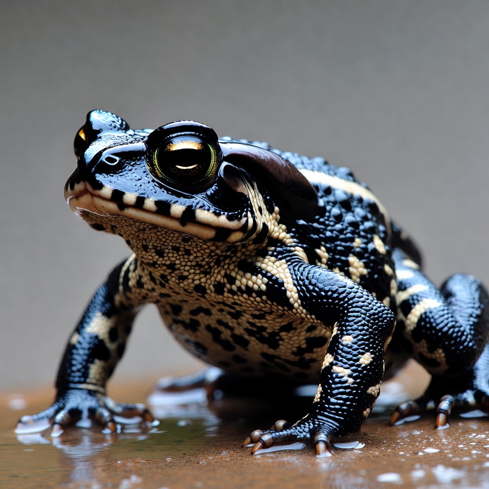 Black and white toad on wet surface