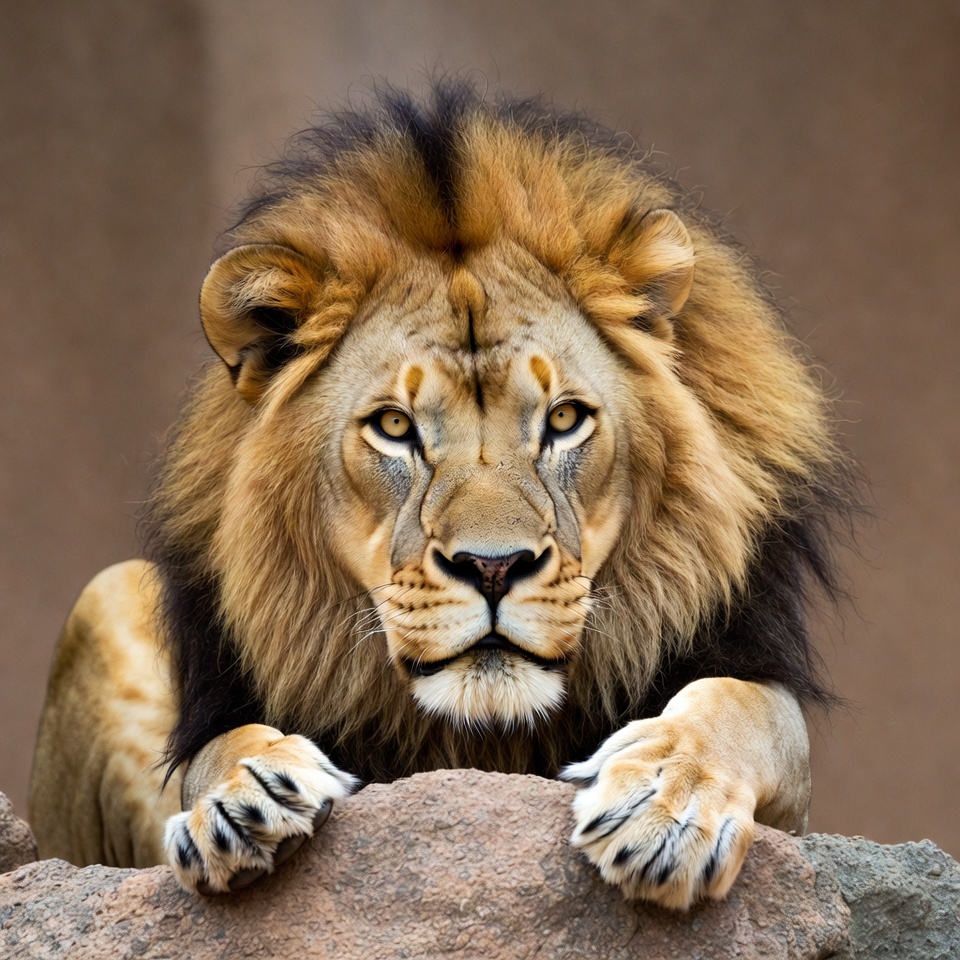 A male lion with a thick dark mane stares intently at the camera. It rests its front paws on a large rock with paws extended. The background is a blurred neutral enclosure.