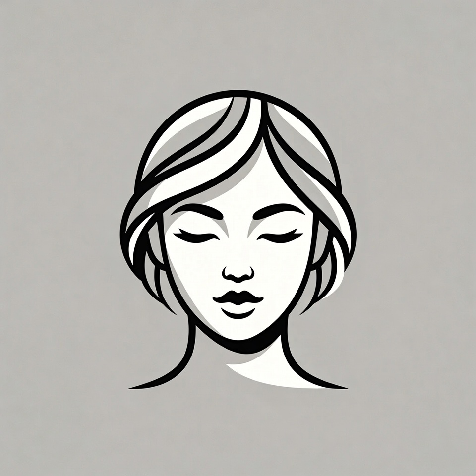A minimalist line art illustration depicts the face of an Asian woman with closed eyes and subtle smile. She has layered bob hairstyle with flowing bangs framing her serene facial features. The black and white vector design is set against a plain gray background.