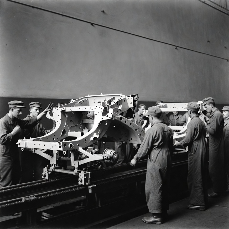 1940s style, White, assembling car, automobile assembly, automotive industry, black and white, caps, car frame, chassis, group of men, industrial factory, labor, machinery, mechanics, men, metal frame, production line, teamwork, vehicle construction, vintage photo, work overalls, workshop, factory workers