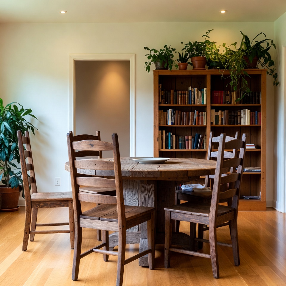 books, bookshelves, bright room, chairs, dining room, empty room, green plants, hardwood floor, home decor, interior design, napkin, natural light, potted plants, round table, rustic furniture, white plate, wooden chairs, wooden table, dining table