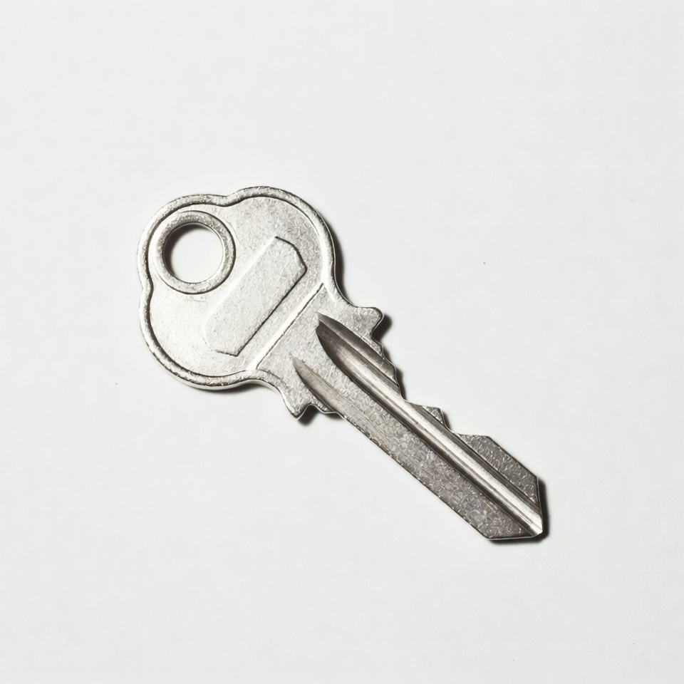 A shiny silver metal house key lies flat on a plain white background. The key features a round hole in the bow and serrated teeth on the blade. It is centered and isolated with ample negative space around it.