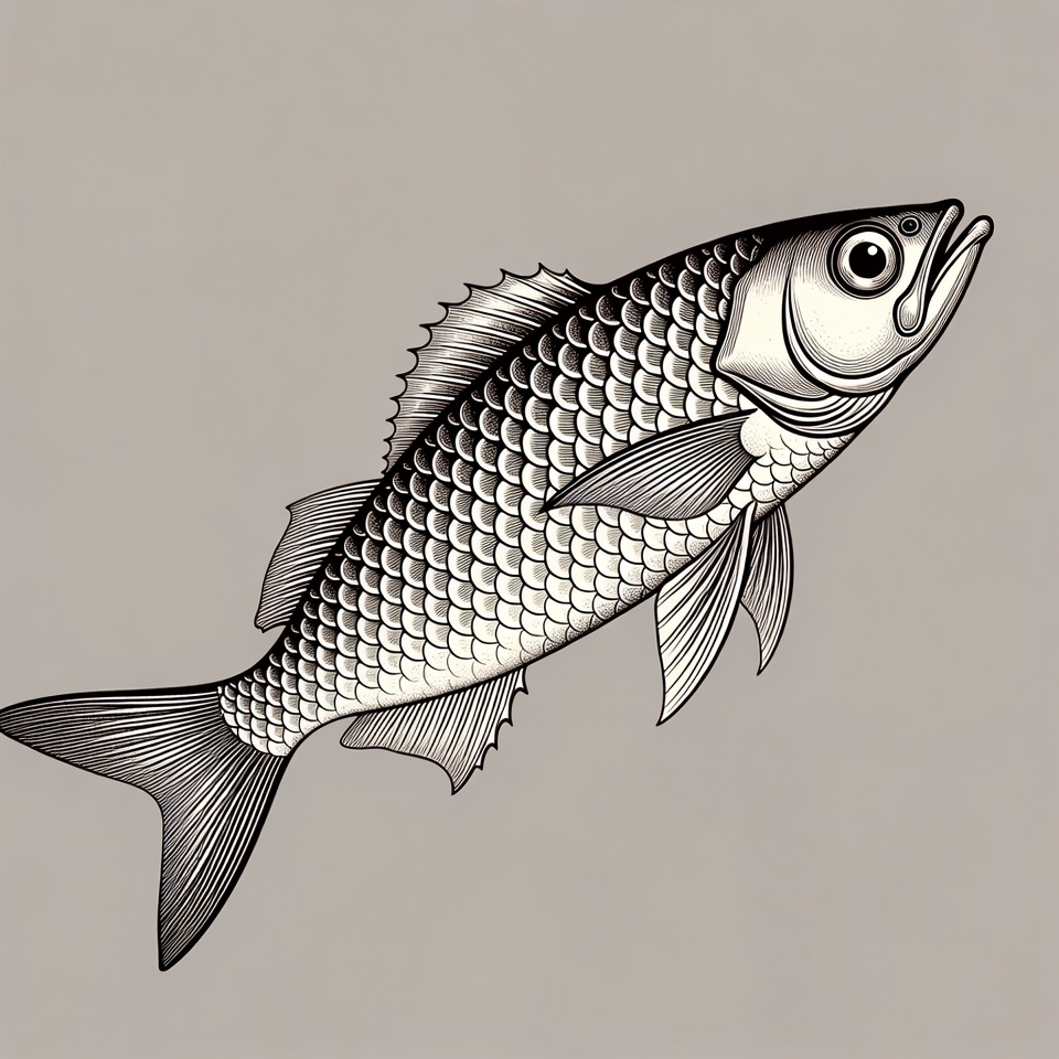 aquatic animal, black and white, detailed drawing, dorsal fin, fins, graphic design, illustration, isolated background, leaping fish, line art, monochrome fish, scales, sea creature, vector art, fish
