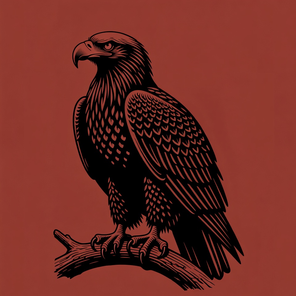 A detailed black silhouette of a bald eagle with intense eyes perches on a wooden branch. The eagle's feathers are intricately textured, and its wings are slightly spread. The image is set against a solid maroon background.