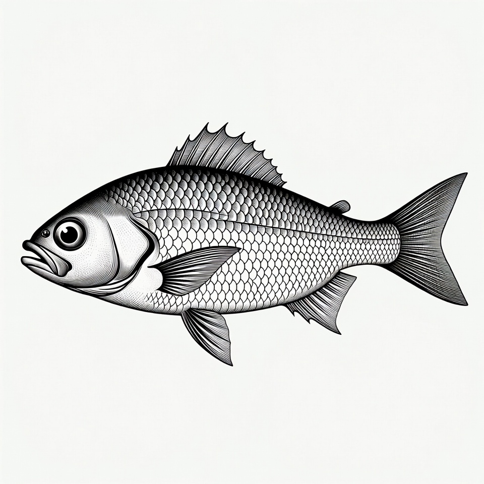 aquatic, big eyes, black and white, clipart, detailed drawing, dorsal fin, finned fish, fish, illustration, isolated background, line art, marine animal, ocean fish, scales, seafood, side view, silver fish, tail fin, vector art, sea bass