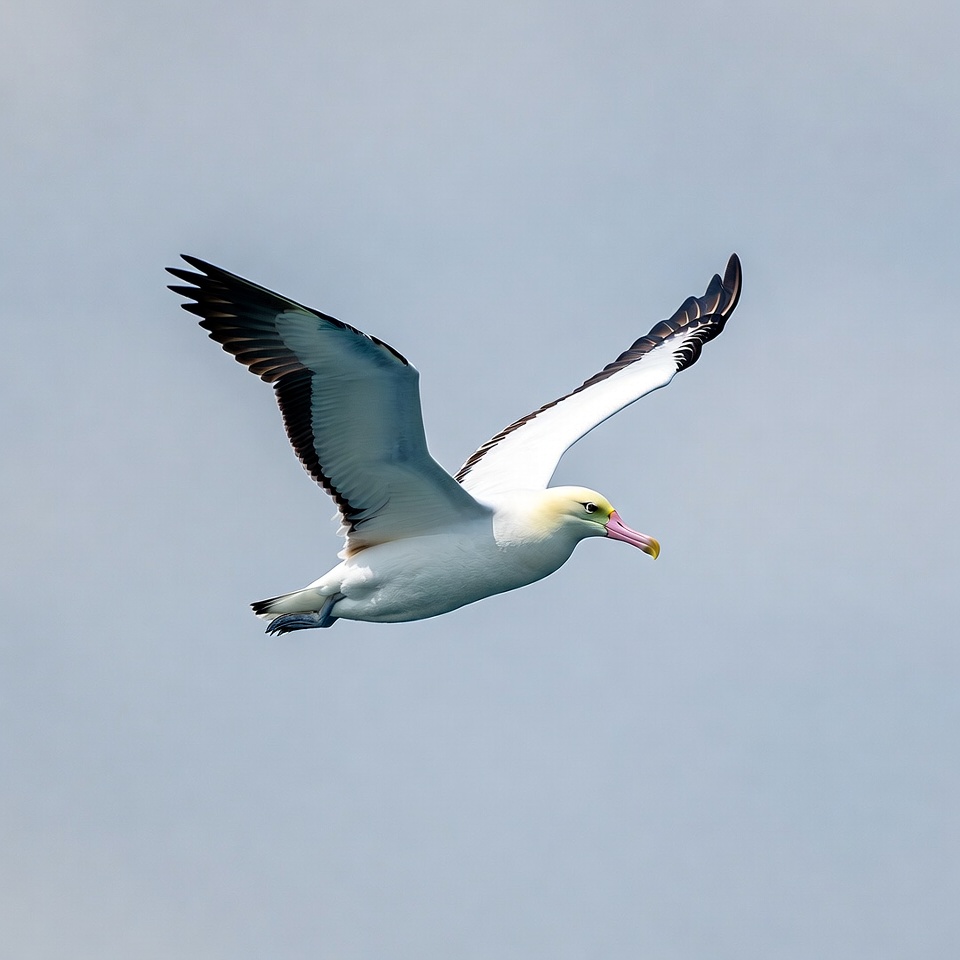 albatross-like, avian, bird flight, birdwatching, black wings, booby bird, flying bird, gray sky, isolated background, nature, ocean bird, pink bill, seabird, soaring, spread wings, white bird, wildlife, yellow crest, Nazca booby
