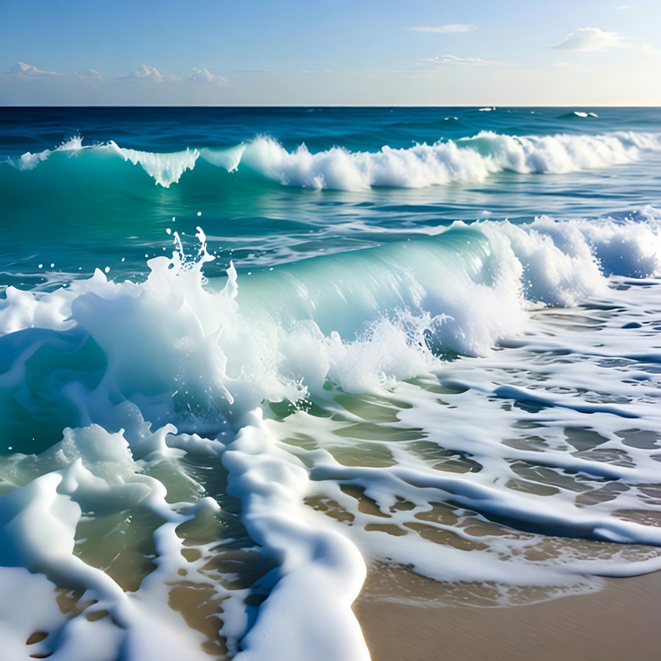 beach, blue sky, coast, crashing waves, foam, horizon, nature, oceanfront, sand, sandy beach, sea, seascape, shoreline, surf, tide, turquoise water, water, waves, white foam, ocean waves