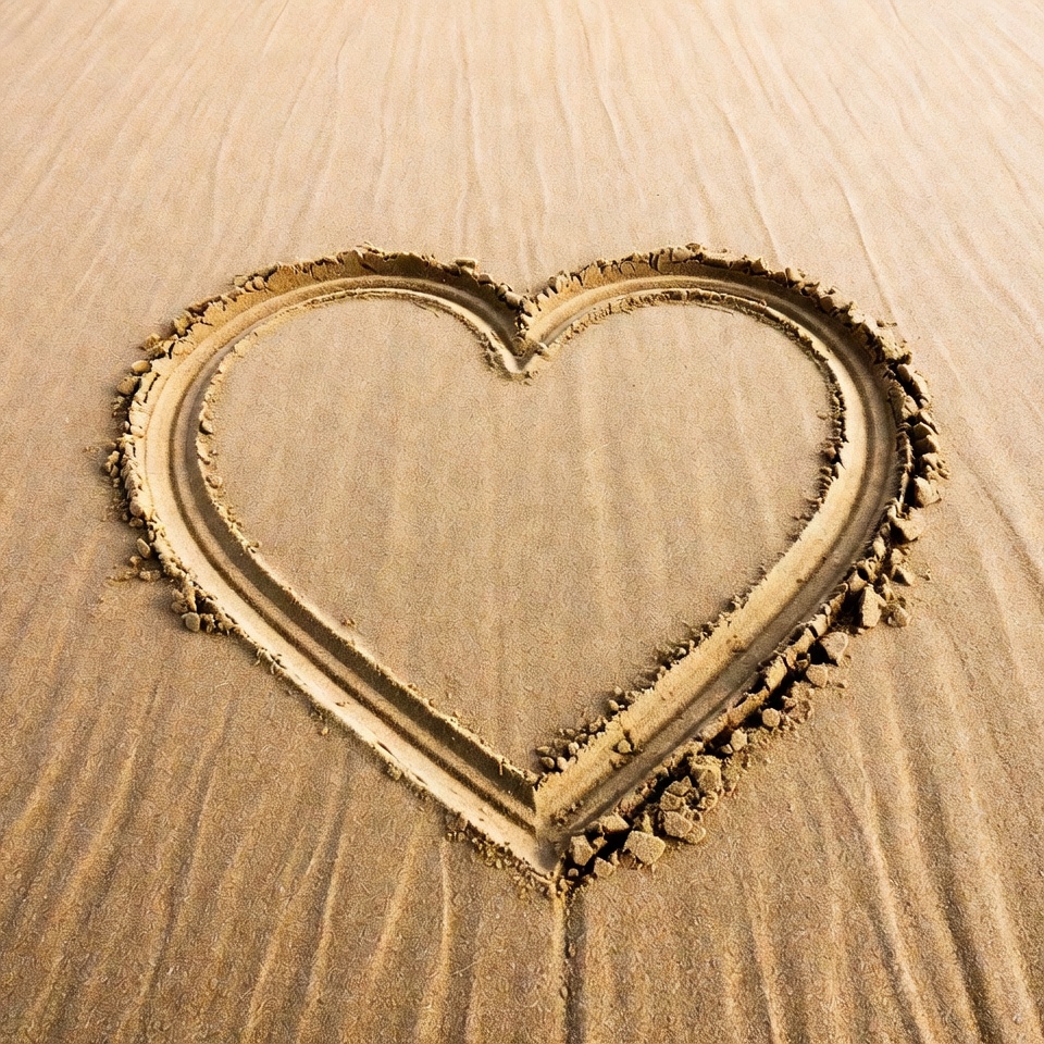 A large heart shape is drawn in the sand on a beach. The heart is formed by a shallow trench with sand piled up along the edges. The sandy beach stretches out evenly around it.
