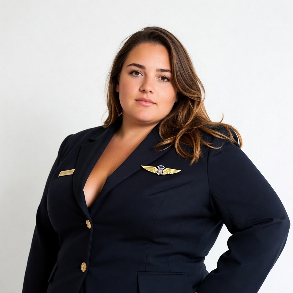 Curvy woman in flight attendant uniform