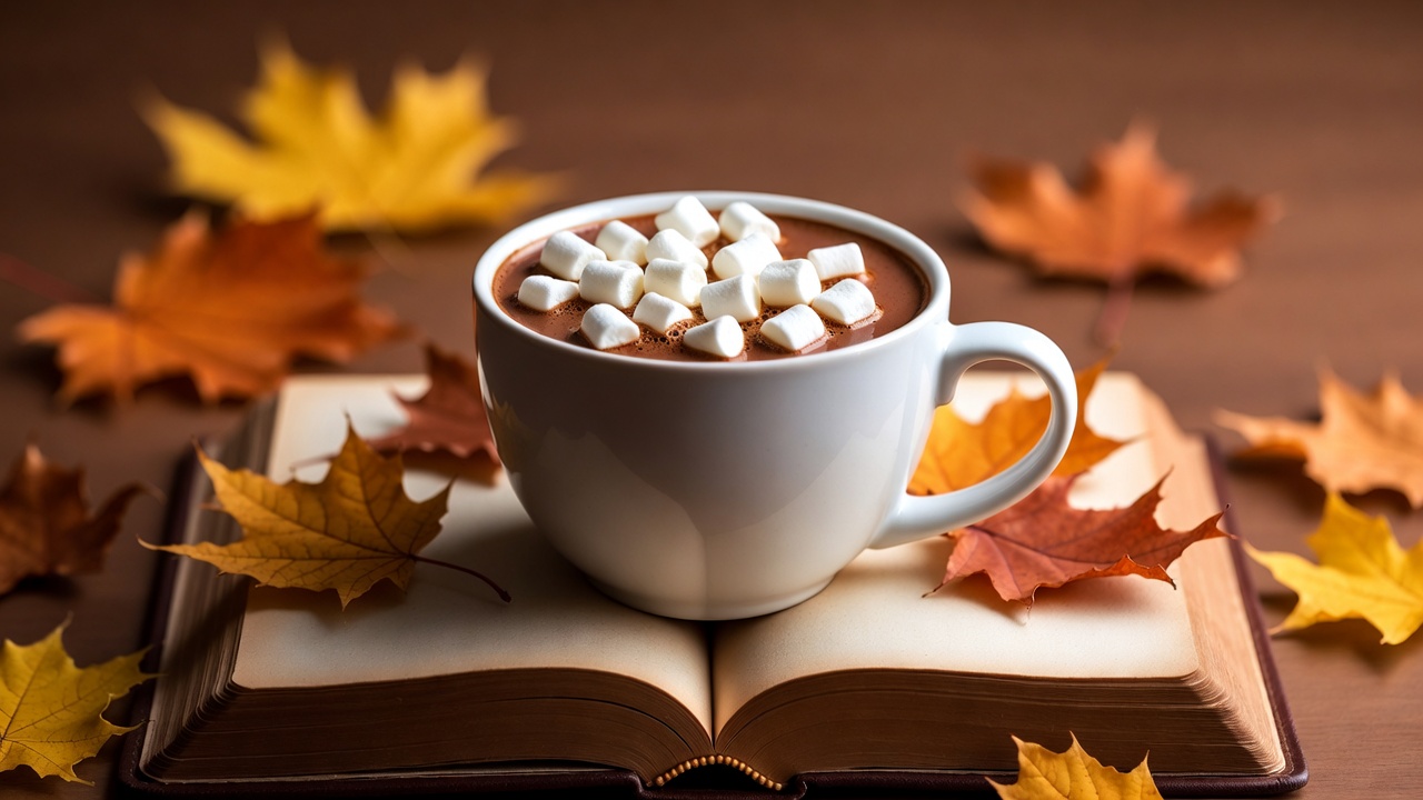 A white mug filled with hot chocolate topped with marshmallows sits open on an antique book. Vibrant yellow and orange autumn leaves are scattered around the mug on a wooden surface. The cozy fall setup features detailed textures on the ceramic mug and foliage.