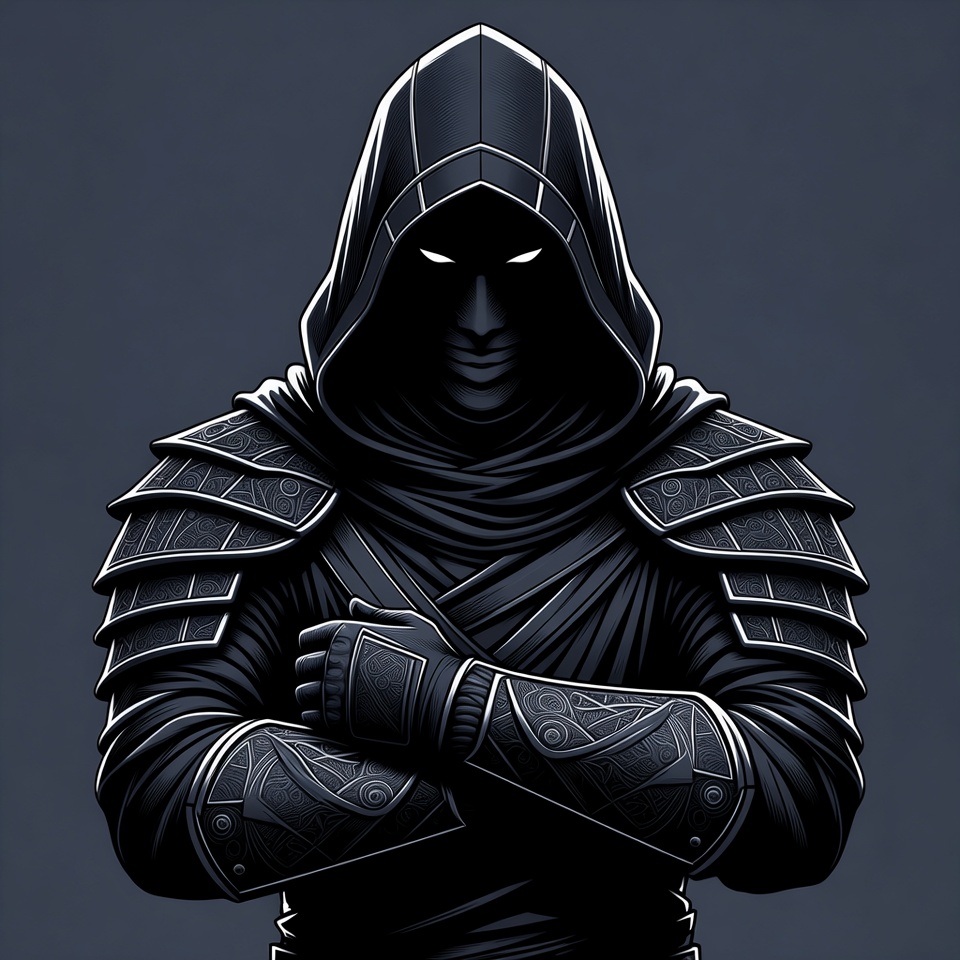 armor, arms crossed, assassin, black hood, clenched fists, dark background, dark cloak, digital art, fantasy warrior, gloves, glowing eyes, illustration, isolated background, male, man, menacing pose, metallic armor, shadowed face, shoulder pads, stealth fighter, hooded man