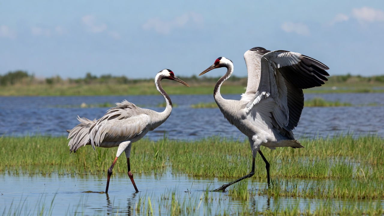 Two elegant red-crowned cranes with gray feathers and black wingtips face each other in a marshy wetland. They stand in shallow blue water surrounded by green reeds under a partly cloudy sky. One crane spreads its wings while both display their distinctive red crowns and long black beaks.