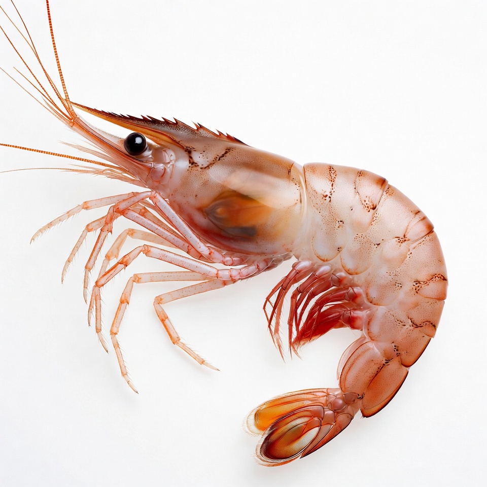 A large pink shrimp with long antennae and legs is positioned on a white background. Its translucent shell shows detailed segments and black eyes. The shrimp curves naturally with claws extended.
