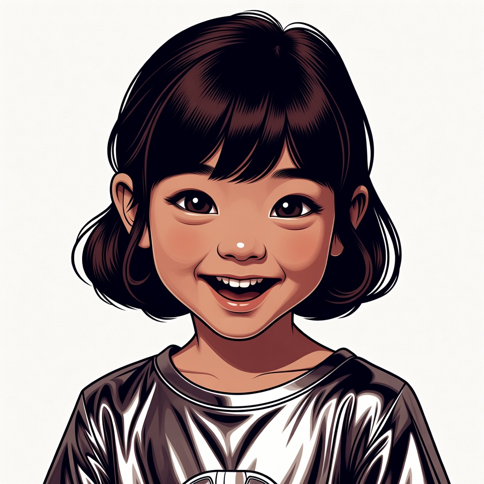 A digital illustration of a young Asian girl with shoulder-length dark brown hair and bangs smiles happily at the viewer. She has large expressive eyes and wears a shiny metallic silver shirt. The portrait is set against a plain white background.