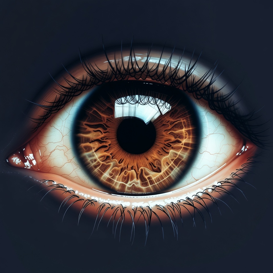 A highly detailed close-up view of a human eye with a striking brown iris featuring intricate golden flecks and radiating patterns. Long dark eyelashes frame the eye, and a reflection is visible in the glossy cornea. The eye is set against a dark background, emphasizing its vibrant colors and textures.