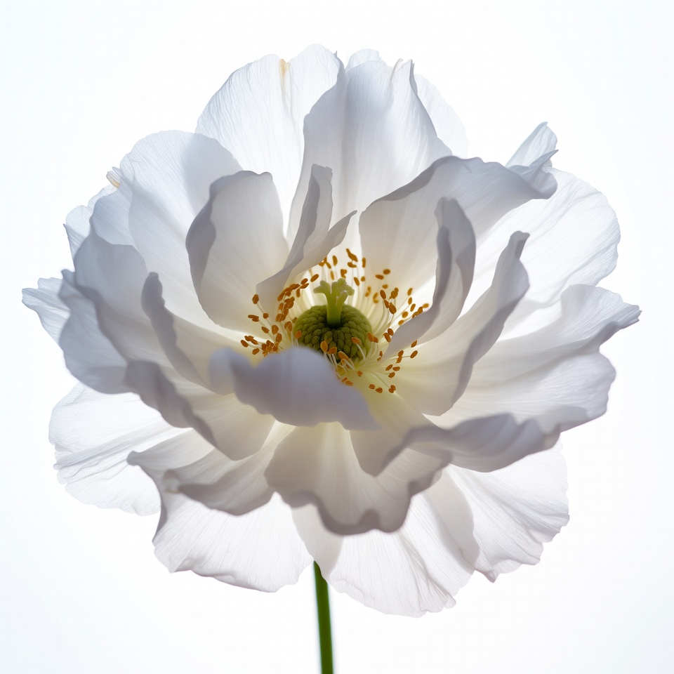 bloom, closeup, delicate petals, floral, flower, green center, green stem, isolated background, nature, petals, poppy flower, stamens, white flower, yellow stamens, white poppy