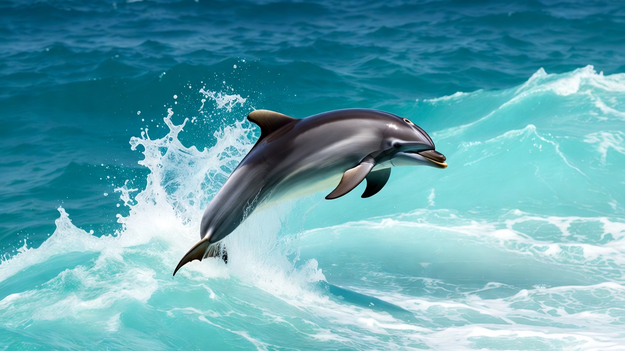 A bottlenose dolphin leaps high above turquoise ocean waves, creating splashes of white water. Its sleek gray body arches gracefully with fins extended and mouth open. The background features clear blue sea and foaming waves.