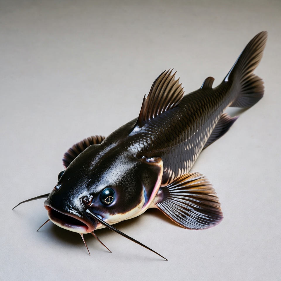 A large black bullhead catfish lies on a plain white surface. It features a broad head, long barbels, dark glossy body with striped patterns, and large expressive eyes. The fins are prominent with orange hues on the edges.