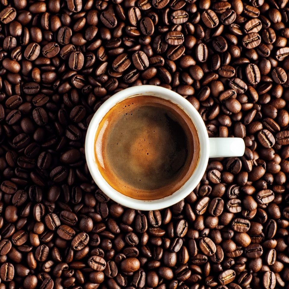 A white ceramic cup filled with dark espresso sits centered on a textured bed of roasted coffee beans. The crema on the espresso surface shows a subtle pattern. The background is entirely covered in scattered coffee beans.