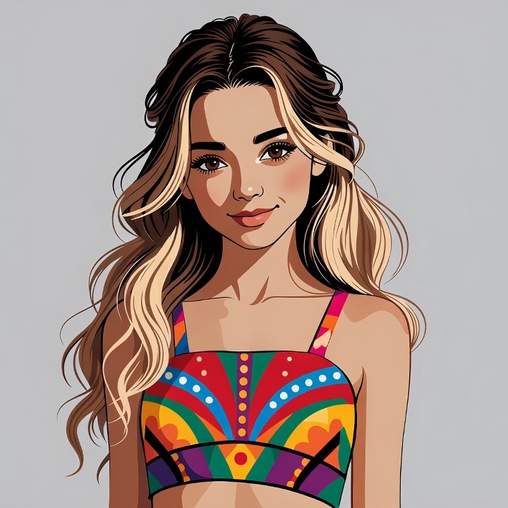 A young woman with long wavy brown hair highlighted with blonde stands smiling against a gray background. She wears a vibrant multicolored strapless bikini top featuring geometric patterns in red, green, blue, yellow, and pink. The illustration style emphasizes her expressive eyes and soft facial features.