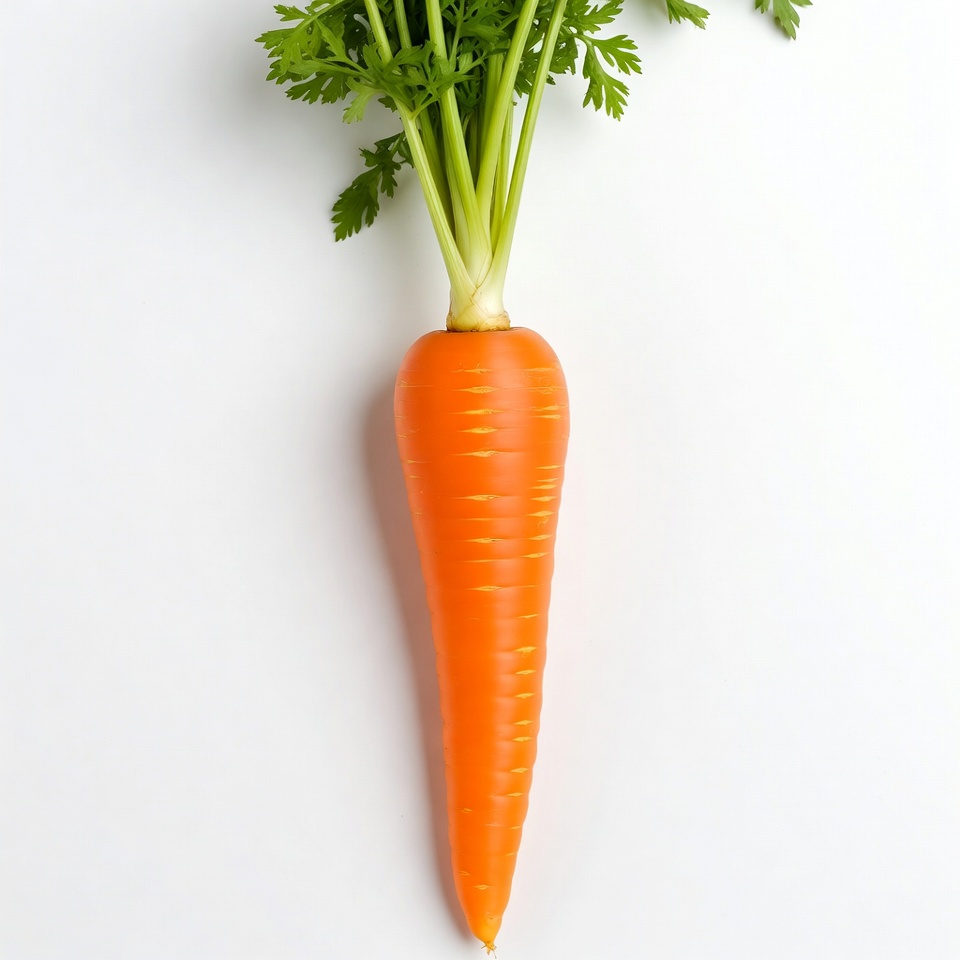 A single fresh carrot with vibrant orange root and lush green tops stands upright on a white background. The carrot features a tapered shape with textured skin and delicate feathery leaves attached to the stem.