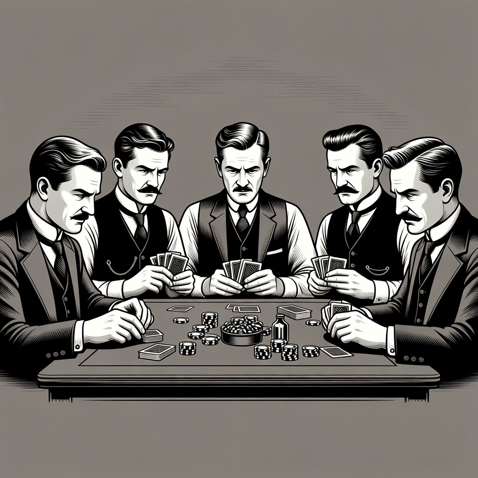 Five men with mustaches in vintage vests and suits sit around a wooden table playing poker cards. They hold cards and poker chips in a black and white illustration style. Poker chips and cards are scattered on the table surface.