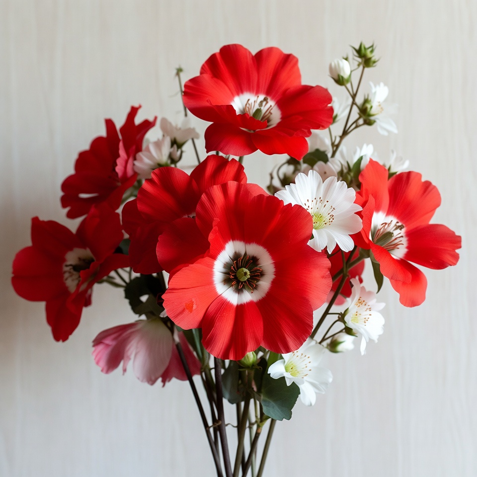 A vibrant bouquet features multiple red poppy flowers with white centers and small white daisy-like flowers. The stems are clustered together against a plain white background. The flowers appear fresh and detailed with green leaves and buds.