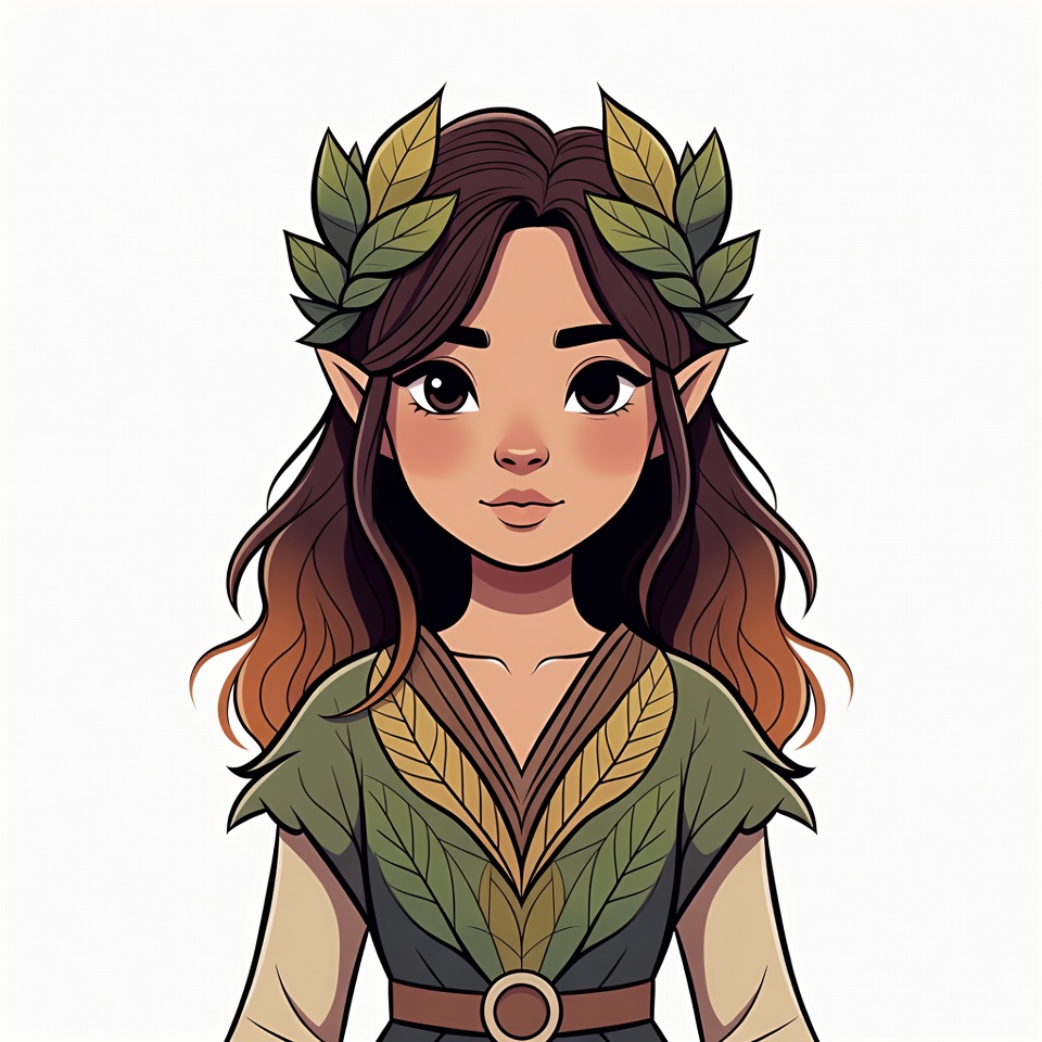 A cute illustrated elf girl with large expressive eyes and brown wavy hair adorned with green laurel leaves. She wears a green leaf-patterned dress with beige sleeves and a belt. The portrait is on an isolated white background.