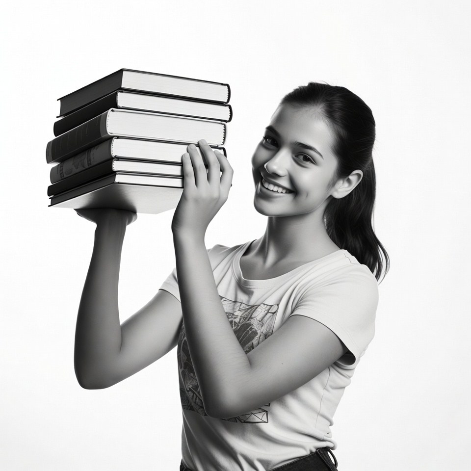 A young Asian woman with dark hair in a ponytail smiles happily while holding a tall stack of books with both hands. She wears a white t-shirt and stands against a plain white background in this black and white photo. Her arms are extended upward as she balances the books on her palms.