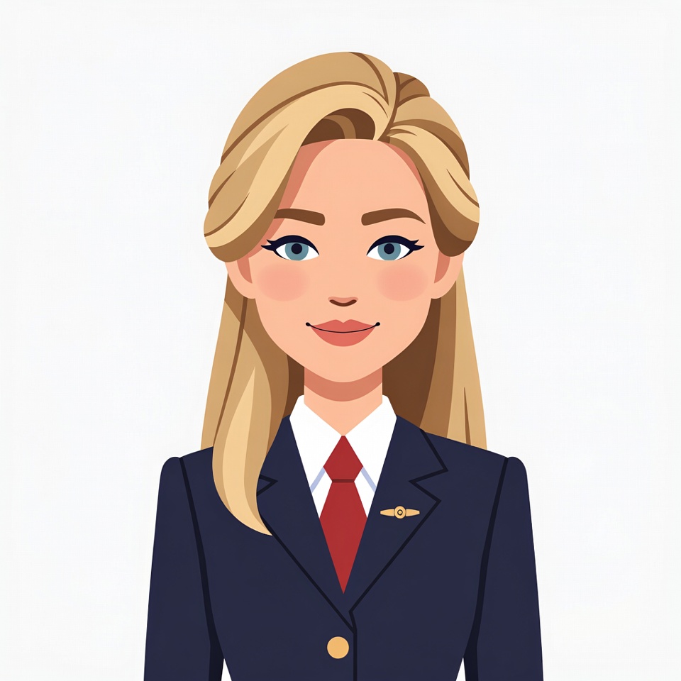A cartoon illustration of a young woman with long blonde hair wearing a navy blue business suit and red tie. She has blue eyes, a smiling expression, and a gold pin on her lapel. The figure stands against a white isolated background.