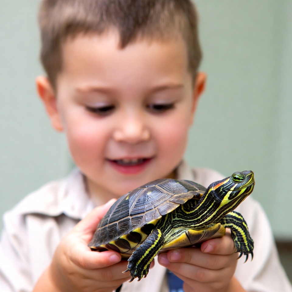 A young boy with light brown hair smiles while holding a red-eared slider turtle in his hands. He wears a beige shirt and stands against a light green background. The turtle features a dark shell with green and yellow stripes and red markings behind its eyes.