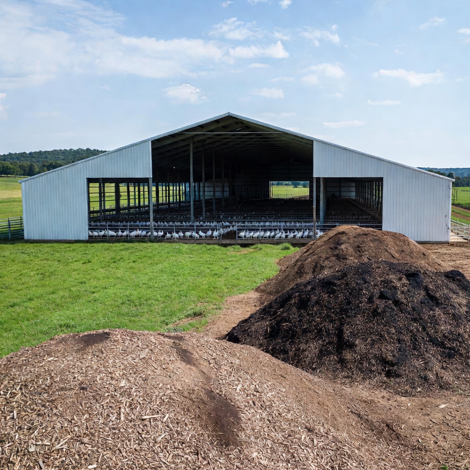 A large open-sided white barn stands in a green field under a partly cloudy sky. Inside the barn, rows of chickens are visible on the floor. Piles of dark manure are situated in front of the barn.
