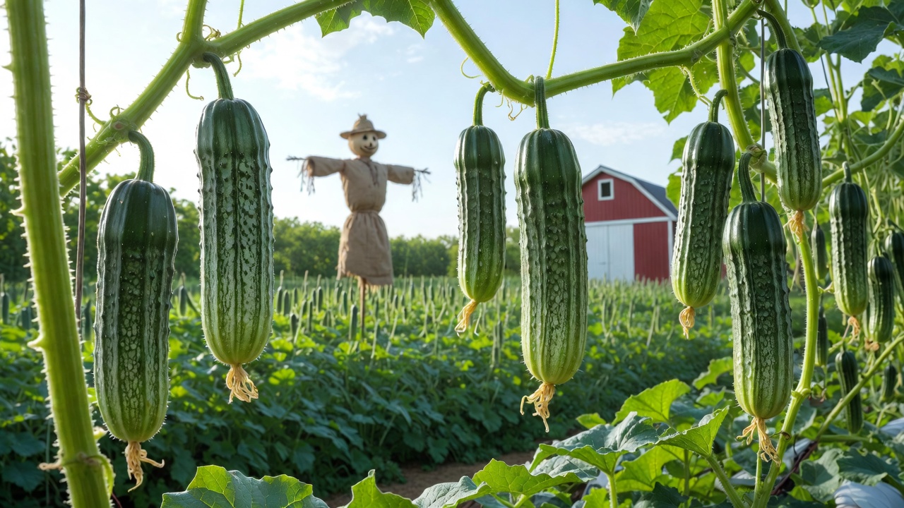 A scarecrow dressed in beige clothes and a hat stands in a cucumber field with a red barn in the background. Large green cucumbers hang from vines framing the foreground. The scene features rows of green plants under a blue sky.