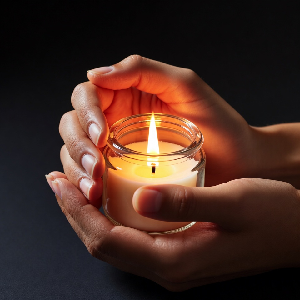 A pair of female hands gently cups a small glass jar containing a lit candle. The warm flame glows brightly against the dark background, illuminating the smooth skin and neatly manicured nails of the hands. The candle wax is partially melted, with the wick burning steadily.