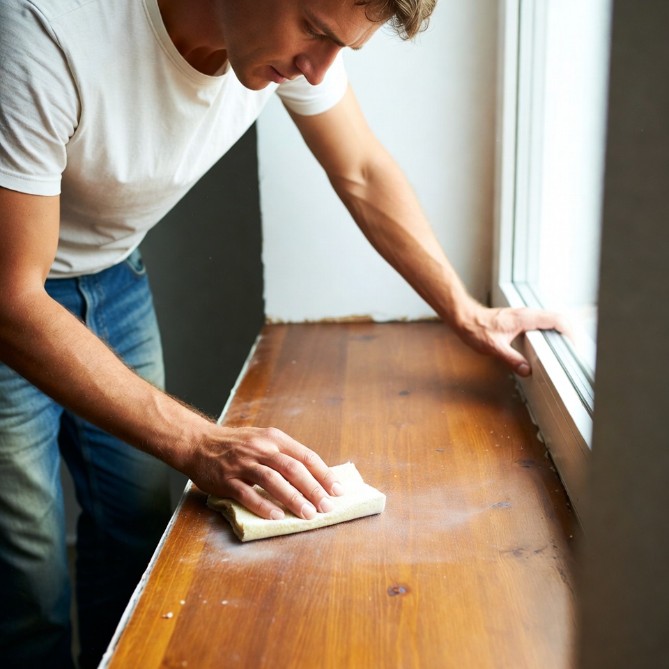 A man with short hair wears a white t-shirt and jeans while sanding a wooden windowsill. He leans forward, gripping sandpaper firmly with both hands to smooth the surface. Natural light streams through the nearby window onto the wood dust.