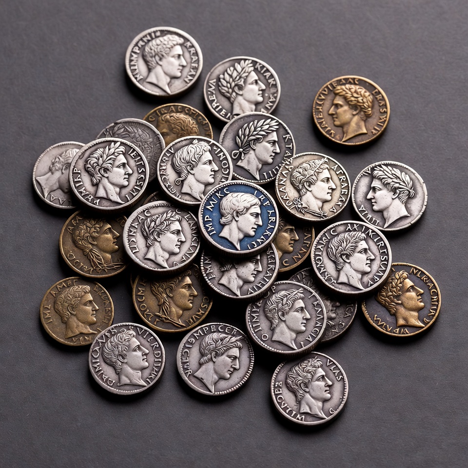 A collection of antique Roman coins is scattered on a dark gray surface. The coins feature detailed profiles of emperors and figures with laurel wreaths, in silver, gold, and bronze tones. One blue-toned coin stands out among the metallic stack.